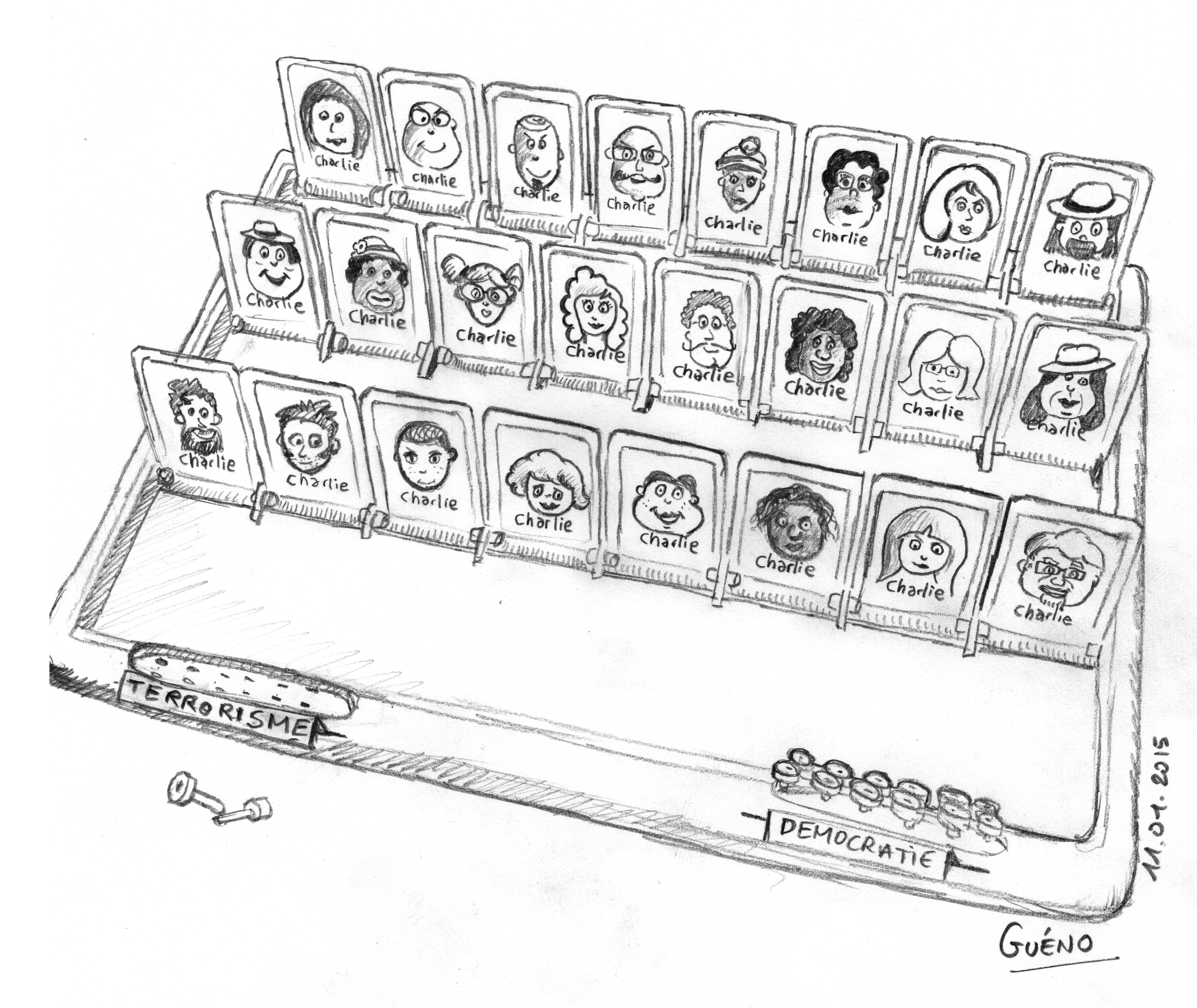 Petit dessin, suite aux événements du 7 janvier 2015 et plus particulièrement aux rassemblements spontanés, partout dans le monde. On est tous Charlie.